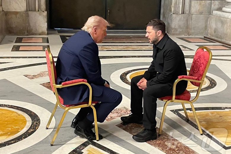 도널드 트럼프 미국 대통령과 볼로디미르 젤렌스키 우크라이나 대통령이 26일 (현지시간) 바티칸의 성 베드로 광장에서 열린 프란치스코 교황의 장례 미사에 앞서 '백악관 충돌' 두 달 만에 독대를 하고 있다. 2025.04,27 ⓒ AFP=뉴스1 ⓒ News1 우동명 기자