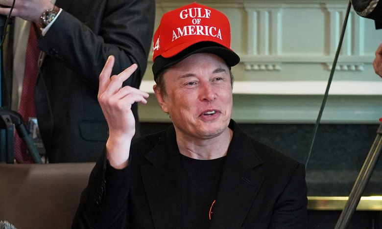 30일(현지시간) 미국 워싱턴 백악관에서 열린 각료회의에 마지막으로 참석한 일론 머스크 테슬라 최고경영자(CEO)가 ‘미국만’(GULF OF AMERICA)이 쓰인 모자를 쓰고 웃고 있다. 워싱턴=AP연합뉴스 |