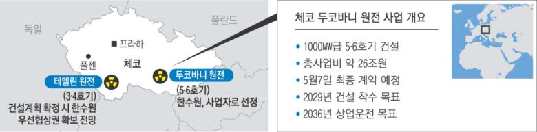 이번 사업은 4기로 구성된 체코 두코바니 원전 단지에 1000㎿(메가와트)급 2기(5·6호기)를 추가로 건설하는 것으로 사업비는 26조원 규모로 추산된다. 향후 테멜린 원전 2기 건설 계획도 확정되면 이번 계약 조건에 따라 한수원은 또 우선협상 자격을 얻는다.