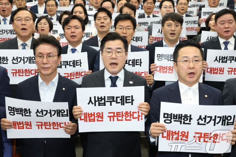 국민의힘은 대법원 선고에 환영 입장을 밝히며 곧바로 이 후보를 향한 총공세에 돌입했다. 권영세 비상대책위원장과 권성동 원내대표 등 당 지도부와 김문수·한동훈 대선 경선 후보는 "이 후보는 즉각 사퇴하라"고 한목소리를 냈다.