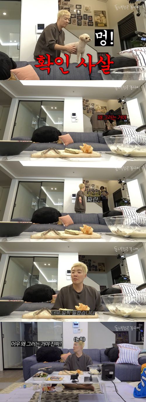 1일 오후 유튜브 채널 '동네친구 강나미'에는 '상화 몰래 생방송(Live) 켜고 튀김 덮밥 먹었습니다'라는 제목의 영상이 업로드됐다