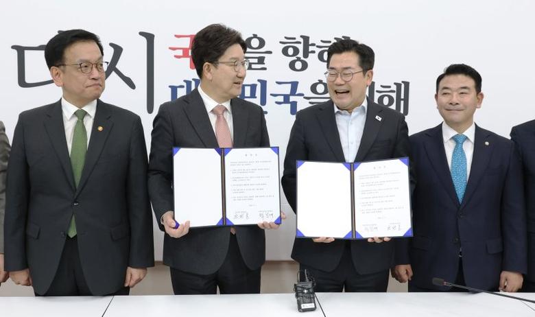 권성동 국민의힘 원내대표와 박찬대 더불어민주당 원내대표가 1일 오전 서울 여의도 국회에서 추경안 합의문에 서명한 뒤 기념촬영을 하고 있다. 왼쪽부터 최상목 경제부총리 겸 기획재정부장관, 권 원내대표, 박 원내대표, 박정 예결특위원장. 뉴스1 |