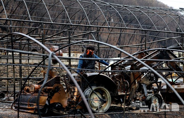 [안동=뉴시스] 이무열 기자 = 14일 경북 안동시 임하면 추목리 한 농가에서 산불 피해를 입은 한 주민이 불에 탄 농기계를 살펴보고 있다. 2025.04.14. lmy@newsis.com |
