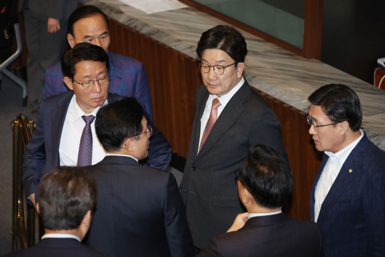 권성동 국민의힘 원내대표와 의원들이 1일 오후 서울 여의도 국회에서 열린 본회의에서 최상목 경제부총리 겸 기획재정부장관 탄핵소추안을 추가상정하는 의사일정 변경동의의 건이 상정되자 대화하고 있다. 뉴스1