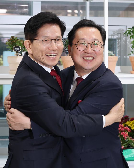 김문수 국민의힘 대선 경선 후보(왼쪽)가 1일 오후 대전시 동구 동대전도서관에서 이장우 대전시장과 회동에 앞서 포옹하고 있다. [뉴스1]
