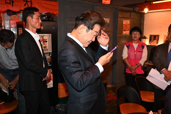 이재명 더불어민주당 대선후보가 1일 오후 서울 종로 한 식당에서 노동자들과의 간담회 뒤 항소심 파기를 선고한 상고심 내용을 확인하고 있다. 이날 대법원 전원합의체는 이 후보의 공직선거법 항소심 무죄를 대법관 12명 중 10명 다수의견으로 파기했다.