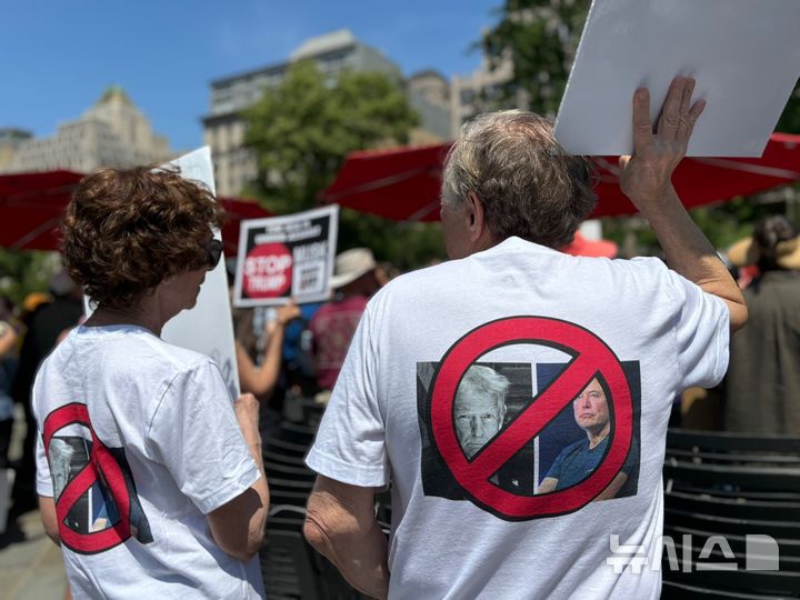 [워싱턴=뉴시스]이윤희 특파원 =국제 노동절인 1일(현지 시간) 미국 전역에서는 도널드 트럼프 행정부에 반대하는 집회가 동시다발적으로 벌어진 가운데, 미국 워싱턴DC 백악관 인근 프랭클린 공원에서 열린 '메이 데이' 집회에 트럼프 대통령과 일론 머스크를 비판하는 티셔츠를 입고 참석한 참가자들. 2025.05.02. |
