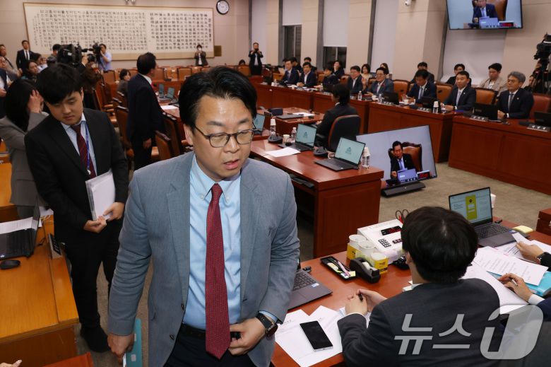 국민의힘 의원들이 1일 오후 서울 여의도 국회에서 열린 법제사법위원회 전체회의에서 최상목 경제부총리 겸 기획재정부장관 탄핵소추사건 조사결과보고서 채택의 건 의결에 반대하며 회의장을 나가고 있다. 2025.5.1/뉴스1 ⓒ News1 이광호 기자