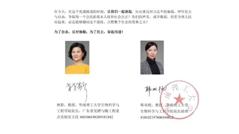 이 선언문은 중국 광둥성 광저우시 화난이공대학 린잉 학장과 한솽옌 교수가 작성한 것으로 돼 있지만, 선언문의 진위는 확인되지 않았다고 중화권 매체들은 전했습니다.