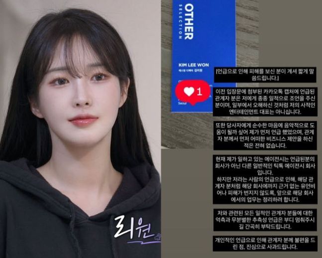 이후 리원은 자신의 SNS에 "언급으로 인해 피해를 보신 분이 계셔 짧게 말씀드린다. 이전 입장문에 첨부된 카카오톡 캡처에 언급된 관계자 분은 저에게 종종 일적으로 조언을 주신 분이며, 일부에서 오해하신 것처럼 저의 사적인 엔터테인먼트 대표는 아니다"며 "당사자에게 순수한 마음에 음악적으로 도움이 될까 싶어 제가 먼저 언급했었으며, 관계자 분께서 먼저 어떠한 비즈니스 제안을 하신 적은 전혀 없다. 현재 제가 일하고 있는 에이전시는 언급된 분의 회사가 아닌 다른 일반적인 틱톡 에이전시 회사"라며 말을 바꾸고 해명했다.