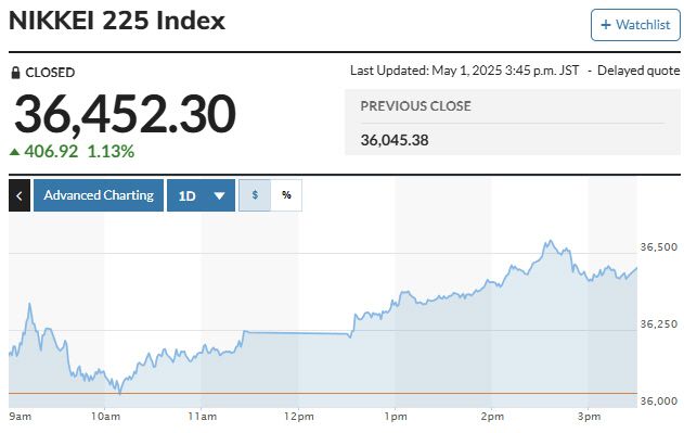 1일 일본증시 닛케이225지수는 전 거래일 대비 406.92포인트(1.13%) 상승한 3만6452.30에, 토픽스지수는 12.15포인트(0.46%) 오른 2679.44에 마감했다.