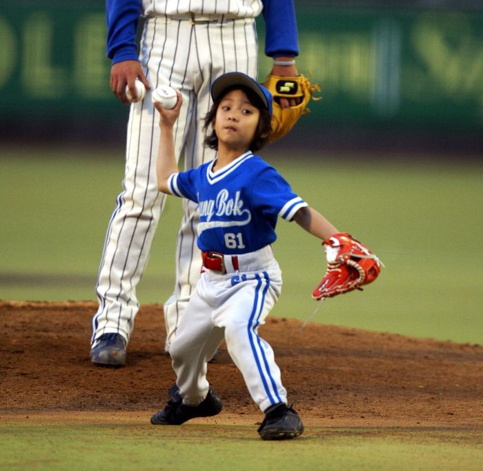 2005년 4월30일 ‘야구신동’ 원태인이 시민구장에서 열린 2005 KBO리그 삼성과 KIA 경기에서 시구하고 있다. 사진 | 삼성 라이온즈