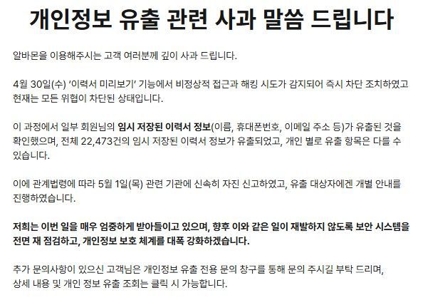 알바몬 측은 "이번 일을 통해 고객 데이터 보호를 최우선 가치로 두는 보안체계를 더 강화하겠다"며 "이번 일로 걱정과 불편을 드려 진심으로 사과드리고 고객 신뢰를 얻기 위해 모든 노력을 다하겠다"고 밝혔다.