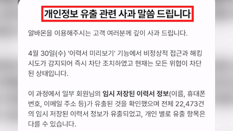 지난 30일 알바몬에 대한 해킹 시도가 감지됐고, 일부 회원의 이력서 정보 2만 2,473건이 유출됐다고 알렸습니다.