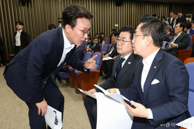 (서울=뉴스1) 이광호 기자 = 박찬대 더불어민주당 대표 직무대행 겸 원내대표와 박성준 원내수석부대표, 김민석 최고위원이 1일 오후 서울 여의도 국회에서 열린 긴급 의원총회에서 대화하고 있다.  2025.5.1/뉴스1  Copyright (C) 뉴스1. All rights reserved. 무단 전재 및 재배포,  AI학습 이용 금지. /사진=(서울=뉴스1) 이광호 기자