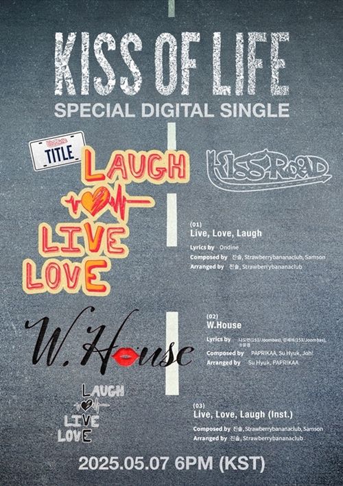 2일 0시 공식 채널을 통해 KISS OF LIFE(키스오브라이프)의 앞으로의 여정을 상징하는 도로와 함께 신곡 명이 최초 공개됐다. 이번 앨범에는 타이틀곡 ‘Live, Love, Laugh’과 수록곡 ‘W. House’가 담겼다.