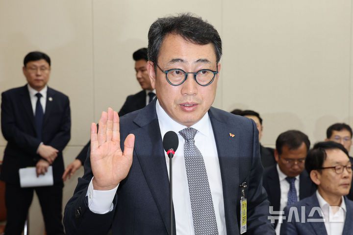[서울=뉴시스] 권창회 기자 = 30일 오전 서울 여의도 국회에서 열린 과학기술정보방송통신위원회 전체회의에서 유영상 SKT텔레콤 사장이 증인선서를 하고 있다. 2025.04.30. kch0523@newsis.com |