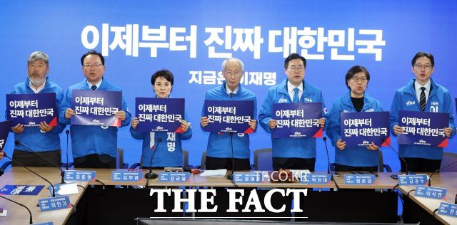 윤여준, 박찬대 더불어민주당 상임 총괄선대위원장을 비롯한 참석자들이 2일 오전 서울 여의도 중앙당사에서 열린 중앙선거대책위원회의에서 구호를 외치고 있다. 왼쪽부터 김동명, 김부겸, 강금실 총괄선대위원장, 윤여준, 박찬대 상임 총괄선대위원장, 정은경, 김경수 총괄선대위원장. /뉴시스