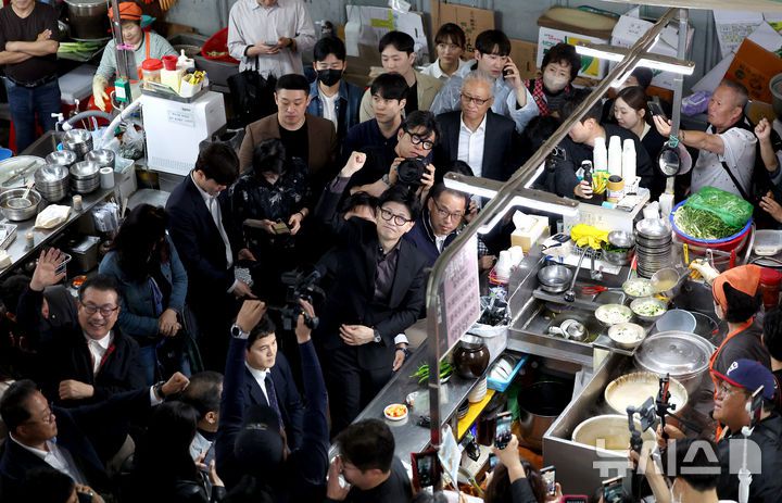 [대구=뉴시스] 이무열 기자 = 한동훈 제21대 대통령 선거 국민의힘 경선 후보가 1일 대구 중구 서문시장을 찾아 지지자들에게 인사하고 있다. 2025.05.01. lmy@newsis.com |