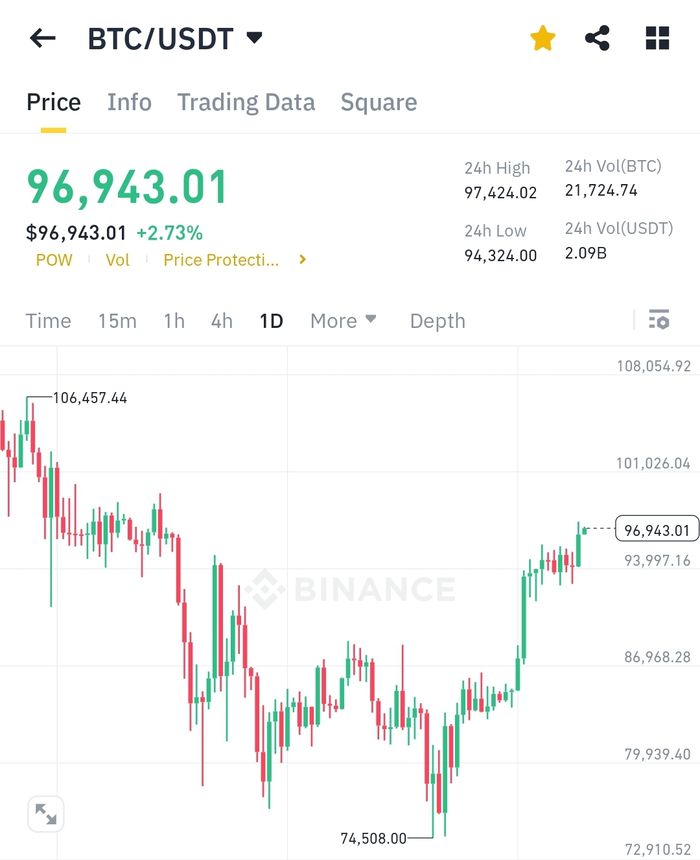 2일 비트코인은 이날 오전 9시 50분 기준으로 24시간 전보다 2.73% 오른 9만6943달러에 거래되고 있다. 비트코인은 전날 9만7000달러선을 넘어선 뒤 소폭 하락해 9만6900달러선에 거래되고 있다. 비트코인이 9만7000달러선을 넘은 건 지난 2월 21일 이후 70일만에 처음있는 일이다. 관세 쇼크로 지난달 7일 기록한 7만4508달러의 저점 이후 30% 넘게 반등하는데 성공했다.