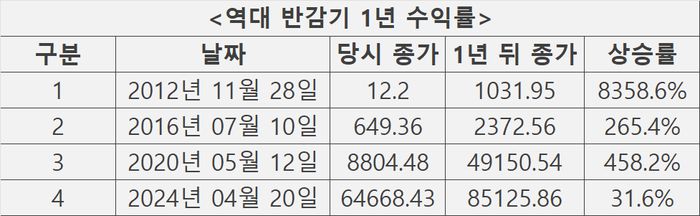 지난 2012년 첫번째 반감기 이후 1년간 비트코인은 8000% 이상 상승했다.