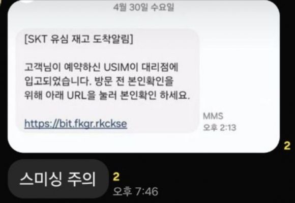SK텔레콤 가입자를 대상으로 유심 예약 및 교체가 진행되는 가운데 유심 재고가 도착했다는 ‘스미싱’(문자메시지로 악성 링크나 앱 설치를 유도해 정보를 빼내는 사기 수법)에 유의해야 한다.