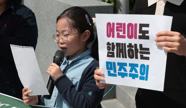 이나연 어린이가 2일 서울 종로구 세계어린이운동발상지 기념비 앞에서 열린 ‘노키즈존은 차별이다’ 캠페인 출범 기자회견에서 노키즈존의 문제점을 비판하는 발표를 하고 있다. 연합뉴스