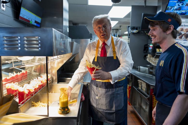 2024년 10월20일, 선거 유세 중인 도널드 트럼프 당시 공화당 대통령 후보가 펜실베이니아주의 한 맥도널드에서 프렌치프라이를 조리하고 있다. AP연합뉴스