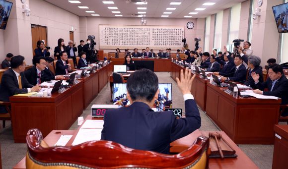 ‘대통령 당선시 재판정지’ 형사소송법 개정안 소위 회부 - 정청래 국회 법사위원장과 더불어민주당을 비롯한 의원들이 2일 오후 서울 여의도 국회에서 열린 법제사법위원회 전체회의에서 ‘대통령 당선시 재판정지’ 형사소송법 개정안 소위 회부에 대해 거수로 찬성 표시를 하고 있다. 2025.05.02 뉴시스 |