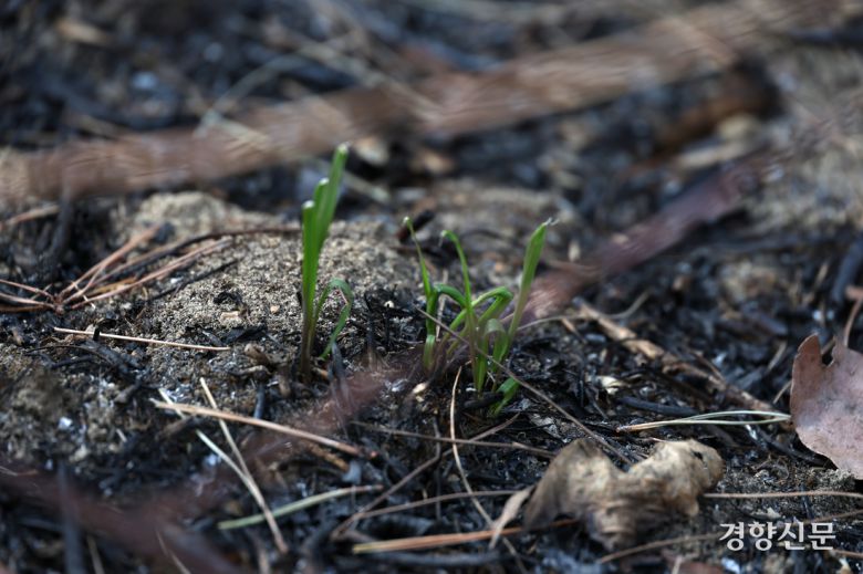 지난 3월 31일 경북 산불 최초 발화지로 지목된 의성군 안평면 괴산리 산불 발생 현장 인근에 초록색 풀이 돋아나 있다. 의성|권도현 기자