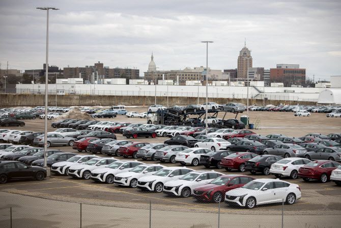 도널드 트럼프 대통령이 캐나다와 멕시코산 상품에 25%의 관세를 부과한 첫날인 지난 3월 4일 미시간주 랜싱의 GM 공장에 신차들이 주차되어 있다. (사진=AFP) |