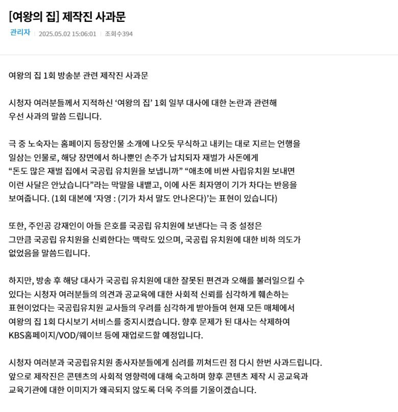 제작진은 "국공립 유치원에 대한 비하 의도가 없었다. 하지만 방송 후 해당 대사가 국공립 유치원에 대한 잘못된 편견과 오해를 불러일으킬 수 있다는 시청자 여러분들의 의견과 공교육에 대한 사회적 신뢰를 심각하게 훼손하는 표현이었다는 국공립유치원 교사들의 우려를 심각하게 받아들여 현재 모든 매체에서 '여왕의 집' 1회 다시보기 서비스를 중지시켰다"고 알렸다.