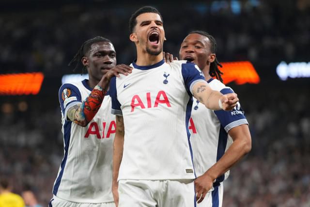 토트넘의 도미닉 솔란케(가운데)가 2일 영국 런던의 토트넘 홋스퍼 스타디움에서 열린 보되/글림트와의 2024~25시즌 UEFA 유로파리그 준결승 1차전 홈경기에서 후반 페널티킥 쐐기골을 성공해 기뻐하고 있다. 런던=AP 연합뉴스
