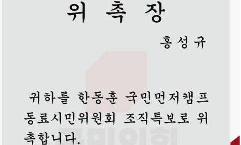 지난달 30일 홍성규 진보당 대변인은 자신에게 온 휴대폰 문자로 온 특보 위촉장을 제시하며 “한동훈 캠프 명단에 제 이름이 들어있느냐?”라고 항의했다. 한 후보와 정치적 성향이 전혀 다른 진보당 소속인 그는 “제 동의를 구한 적도 없을뿐더러, 당연히 저는 내란 본당 국민의힘의 그 어떤 후보와도 함께 할 생각이 단 1도 없다”며 공식 사과를 요구했다.