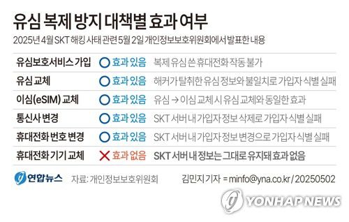 개인정보위 관계자는 "이용자가 유심을 교체했다면 타인이 유심을 복제해 다른 휴대전화에 꽂았다고 하더라고 쓸 수 없게 된다"며 "유심을 바꾸면 가입자 식별번호(IMSI) 및 인증키(K)가 재발급돼 해커가 탈취한 정보와 매칭되지 않기 때문에 기존 정보는 더 이상 유효하지 않게 된다"고 설명했다.