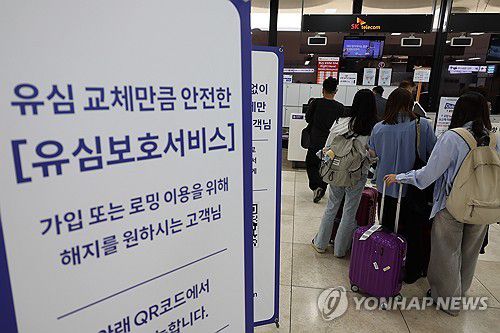 출국 전 유심 교체(서울=연합뉴스) 이정훈 기자 = 2일 서울 강서구 김포공항 국제선 청사 내 SK텔레콤 부스에서 여행객들이 유심 교체를 위해 대기하고 있다. 2025.5.2 uwg806@yna.co.kr