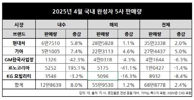2일 현대차·기아·제너럴모터스(GM) 한국사업장·KG모빌리티(KGM)·르노코리아 등 국내 완성차 5개사가 지난 4월 국내외 시장에서 판매한 차는 총 68만 8778대로 집계된다. 기아 특수차 판매와 KGM 반조립(CKD) 판매를 포함한 수치로, 전년 동월 대비 2.4% 늘었다.