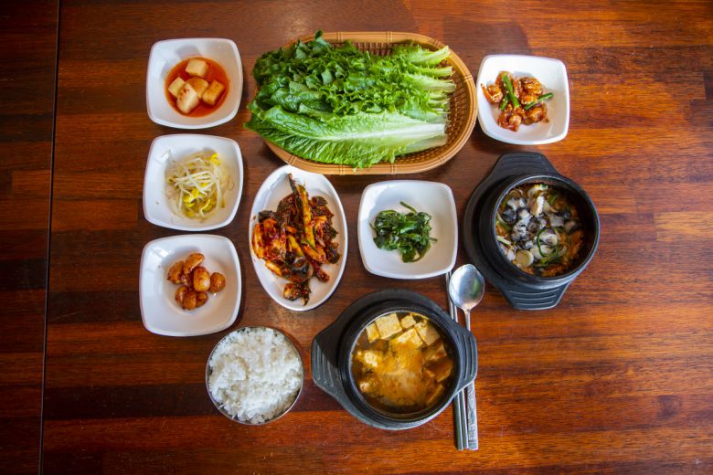이 집의 우렁이 쌈밥정식은 우렁이 강된장과 우렁된장찌개부터 제육볶음, 쑥 전 등 12가지 반찬. 그리고 솥밥과 달걀찜도 맛볼 수 있다. 게다가 직접 키운 식재료를 사용해 신선함까지 더했다.