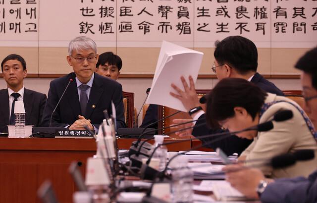 2일 오후 서울 여의도 국회에서 열린 법제사법위원회 전체회의에서 천대엽 법원행정처장이 의원 질의에 답하고 있다. 신소영 기자 viator@hani.co.kr |