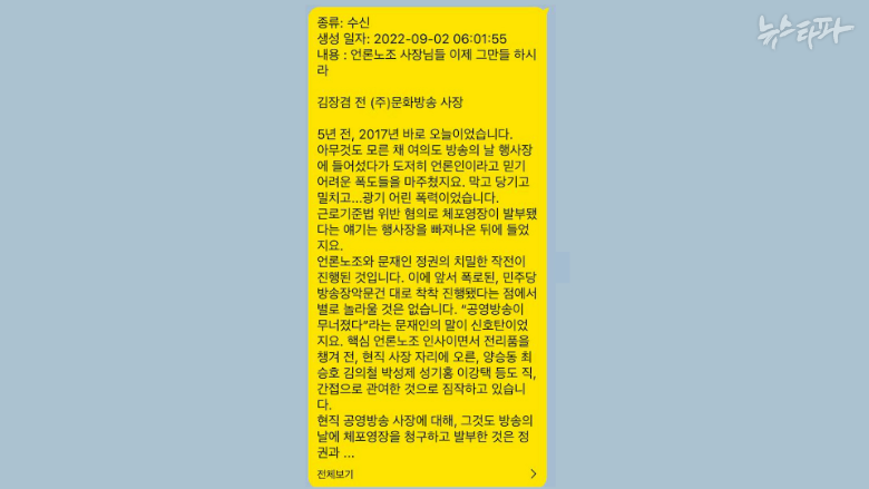 2022년 9월 2일 오전 6시 1분, 김장겸은 방송의날을 맞이해 자신이 작성한 ‘언론노조 사장님들 이제 그만들 하시라’는 글을 명태균에게 공유했다. 자신을 문재인 정권 탄압의 희생양으로 묘사하며 한상혁 방송통신위원장과 KBS, MBC 등 공영방송 사장들이 물러나라고 촉구하는 내용이다.