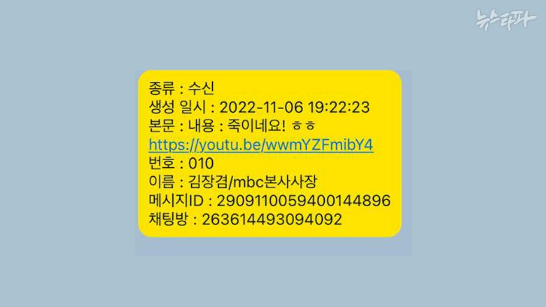 2022년 11월 27일, 민간인 김장겸은 유튜버 '내시십분'의 영상 링크를 명 씨에게 보냈다. “재명아 너는 귀가 썩었냐?"라는 제목으로 이재명 당시 민주당 대표를 비난하는 영상이었는데 조회수가 145만 회가 넘었다. 링크를 전달하며 김장겸은 ▲MBC 빨놈들은 빨겠지! ▲뭐! 시X놈? ▲죽이네요! 라고 적었다.