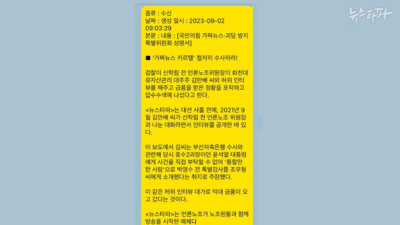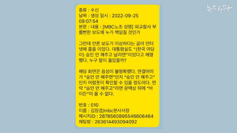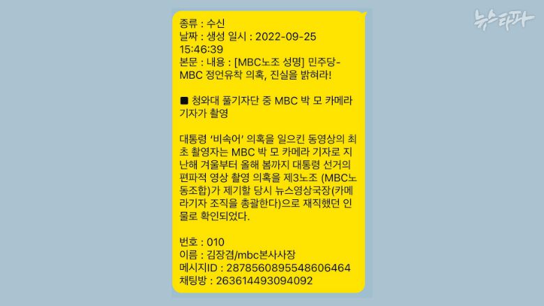 가짜뉴스·괴담 방지 특별위원회 위원장이 된 김장겸은 명태균에게 '신학림 전 언론노조위원장이 김만배와 허위 인터뷰를 하고 금품을 받았다'는 성명서를 보냈다. 이에 명 씨는 ‘파이팅’ 이모티콘으로 화답했다. 이날 대화가 두 사람의 마지막 카톡이다.