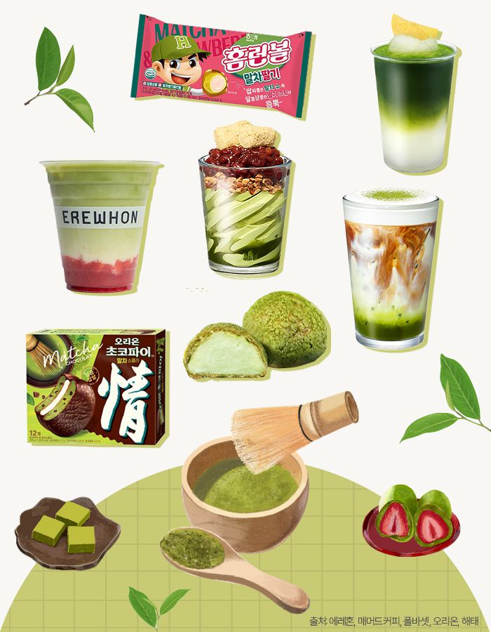 우리나라에서도 말차의 인기가 높아지고 있습니다. 말차 라떼뿐만 아니라 초콜릿, 과자, 케이크 등 간식에서도 초록색을 어렵지 않게 찾을 수 있죠.