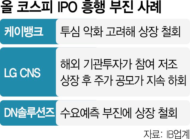 롯데글로벌로지스의 IPO 실패는 개별 종목이 지닌 투자 위험성에 대한 부담이 컸던 이유도 있지만 시가총액 5000억 원 이상 대형급 IPO 수난사가 이어지고 있다는 점에서 업계의 불안감이 커지고 있다. 특히 도널드 트럼프 미국 대통령발 관세 등 대내외적인 정치·경제적 불안정성과 글로벌 증시 불확실성이 확대되면서 해외 투자자들이 자금 투입을 꺼리는 경향이 강하다. 올 초 IPO를 재추진하려던 케이뱅크가 상장을 무기한 연기했고, LG씨엔에스(064400)는 수요예측 당시 해외 기관투자가들로부터 주문을 거의 받지 못했다. 여기에 DN솔루션즈와 롯데글로벌로지스까지 상장을 철회하면서 당분간 IPO 한파 분위기는 장기화할 것으로 전망된다. 한 증권사 IPO 본부장은 “공모액이 1000억 원만 넘어가도 투자가들이 잘 들어오지 않으려고 한다”고 밝혔다.