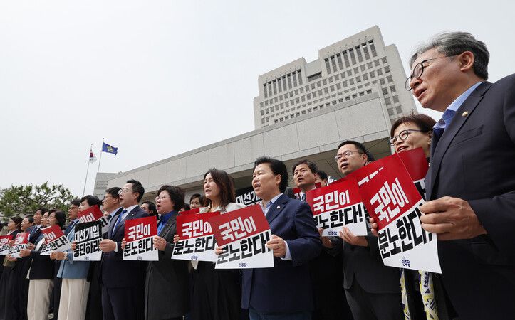 더불어민주당 의원들이 2일 오후 서울 서초구 대법원 앞에서 기자회견을 열어 대법원의 이재명 대선 후보의 공직선거법 위반 사건 상고심 결과를 규탄하고 있다. 신소영 기자 viator@hani.co.kr |