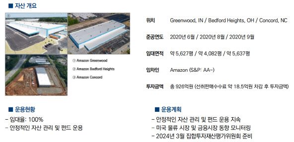 이들 세 아마존 물류센터의 임대차 계약기간은 오는 2032년 7~9월까지다. 아마존 그린우드의 임대차 계약기간은 2032년 7월, 아마존 베드포드 하이츠는 2032년 8월, 아마존 콘코드는 2032년 9월까지다.