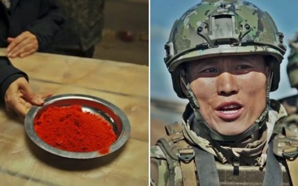 30일(현지시간) 고려인 3세 방송인이자 정치인인 마리나 김(42)은 “전 세계 독점”이라며 쿠르스크에서 직접 만난 북한군 동영상을 공개했다. 사진은 러시아군과 북한군 참호 급식실에 마련된 북한군 전용 고춧가루와 러시아 노래 ‘까츄샤’를 열창하는 북한 병사 모습. 2025.4.30 마리나 김
