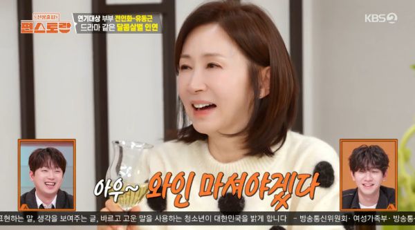이날 전인화는 남편 유동근과의 첫 만남을 언급하며 "드라마에서 남녀 주인공으로 만났다"고 회상했다. 이어 "드라마가 끝난 후 어디서 만나게 됐는데, '너 그렇게 해서 되겠냐. 연기가 그게 뭐냐'고 혼을 내더라"고 말했다.