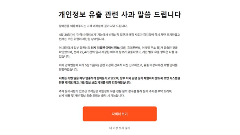 알바몬은 홈페이지에 지난달 30일 이력서 미리보기 기능에서 비정상적 접근과 해킹 시도가 감지됐다며 일부 회원들의 임시 저장 이력서 정부가 유출된 것을 확인했다고 공지했습니다.