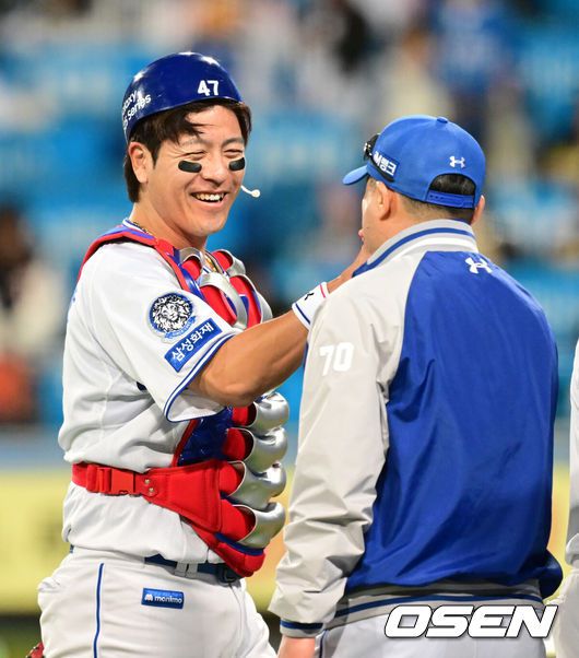 [OSEN=대구, 김성락 기자] 프로야구 삼성 라이온즈가 약속의 8회를 연출하며 짜릿한 승리를 가져왔다.삼성은 2일 대구삼성라이온즈파크에서 열린 두산 베어스와의 홈경기에서 외국인 타자 르윈 디아즈의 결승타로 6-2로 승리했다. 강민호는 개인 통산 2400경기 출장 기록을 세웠다. 역대 첫 번째. 반면 두산은 3연패의 늪에 빠졌다.경기 종료 후 삼성 강민호, 박진만 감독이 기쁨을 나누고 있다. 2025.05.02 / ksl0919@osen.co.kr
